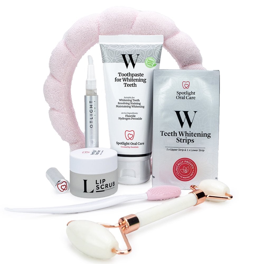 SPOTLIGHT ORAL CARE created by dentists. This amazing set contains all your need for your perfect SMILE. Teeth whitening strips 14 treatments x 28 strips, teeth whitening pen, toothpaste for whitening teeth, lip scrub & exfoliating lip brush, towel headband & jade roller. Complete value of gift box £98 all for only £49